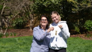 Stacey, the owner of the cherished family heirloom, and her friend Caroline share a joyful moment after the long-lost fish pendant was finally recovered from Caroline’s backyard by Detectorist Brian Rudolph