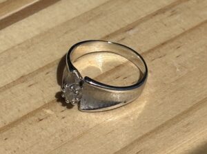 Jewell returned to her kid’s baseball tournament to allow me to continue with my search. Three hours into the search and luckily in the taller grass I got a strong signal on my detector. Indeed, it was Jewell’s gorgeous ring. It was hiding, completely out of sight in the 4” deep grass for a week, just waiting for yours truly to find it for Jewell. Just moments before I located the ring, a family had placed a blanket over the exact area and was enjoying a picnic. It was right after they picked up their stuff 45 minutes later that I was able to detect that spot. I sent a text with the good news to Jewell. She returned to the park within minutes, happy and excited. She said she just couldn’t believe that I found her ring. She expected that I would have already given up on the search. She now knows just how dedicated the Ring Finders are to finding lost rings and other items even when there is little hope or chance of them being found.
