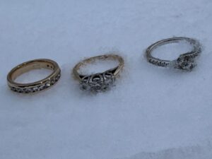 We all went back inside, as it was very cold. When I had arrived, the air temperature was a -3 degrees, without the wind chill. As we were talking and warming up, Maggie told me that she has followed my stories for years and knew who to contact, as soon as Mary told her about her lost rings. As we were all celebrating and smiling I took a photo of Maggie holding the three rings. Mary had asked me not to include any photos of her, in the story, like many other of my clients have in the past. Mary told me she is just not a social media person and I always honor their wish, not to have there photo included. Mary did say I could use the photo of her rings, back on her finger and I could sense a big change in her demeanor. Mary was now smiling, happy and most of all, she couldn’t wait to see her husband, just a half hour from now. What a beautiful moment seeing Mary smiling, awaiting to see her beloved husband, with the precious and sentimental rings, back on her finger, where they belong. I truly have the best job, in the world.🤗❤️🙏