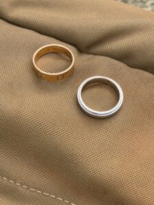 I received a call from a PhD student in Chapel Hill (ironically, a student at Duke, not UNC). He had been playing basketball on an outdoor court and when he made a pass to another player, he flung his rings (plural) off his finger. While the player did catch the ball, the rings disappeared. It was late in the day and he was unable to find them before it got dark, which is when he contacted me. We agreed to meet first thing in the morning because it was a public court – I didn’t want anyone finding it before we had a chance to recover it for him. We met at the court and that’s when he explained the full story. The rings had come off, passed through a chain link fence, and were lost in the brush and briers beyond the fence. He was able to find the first ring on his own, probably 10-12 feet beyond the fence. In searching for the second ring, it became clear that the amount of trash and brush was making the recovery more difficult than it needed to be, so I started to work on cutting out the briers and vines so we could actually see the ground. After probably 30 minutes of “trimming”, I had exposed enough of the ground that we were able to see the ring and grab it. Another happy ending!