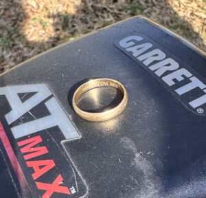 Demetri contacted me about his lost gold ring and explained how he even purchased a cheap metal detector and spent a few frustrating hours searching his yard and only found a handful of junk. He had done some yard work and showed me all the places where he spent time digging and trimming bushes and cutting roots to make way for a good sized above ground planter box. I got busy grid searching for his lost gold ring and I quickly covered the key areas in the front of the house and then proceeded to the side and eventually to the back yard…and his ring was just not there. I asked Demetri more questions about where else he went on the day his ring went missing and he remembered that he had played with his kids in the neighbors front yard. So I figured why not give it a try. Again I began a systematic grid search and on the fourth pass I got a good signal that registered in the gold range and low and behold there was Demetri’s lost gold ring…just laying there in the grass!