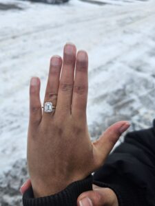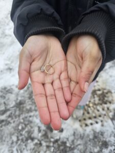 Following an early snowfall in Barrie, I was contacted by Alana. She had lost her engagement ring outside of her 2nd story condo, following the 1st big snow of the season. Once I reached site, I reviewed the situation & using my “Detecting Detective” skills, I was able to locate the ring in under 5 minutes. Urgency was required, as the snowplow was waiting to clear the snow.