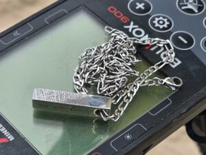When I arrived I met Vanessa, and we walked out to the area of the loss. She explained the the pendant was actually a mini urn with her grandson’s late father’s ashes inside, so it meant a great deal to recover this item. The area was stretched out over about 40 yards, so I began my search promptly. There was not a lot of trash metal, so the search went a bit quicker than usual. About halfway through the area I received a nice signal, dug and had a rectangular pendant in the scoop with chain attached. When I looked at it, it had a screw on the bottom, so I figured this was it. I showed Vanessa who confirmed the find, saying that her family would be forever grateful.