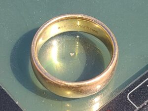 Dan found me in the Ring Finders Directory after losing his wedding band Thanksgiving weekend. He was enjoying the holiday at his home in Wilmington, DE when his ring came up missing. After thoroughly searching the inside of his house he reached out to me Sunday and I made arrangements to meet him that same day. When I got there he shared that he thought the ring most likely flew off his finger while he was tossing around a football with the kids in the side yard of his home. The side yard is about 1/8 of an acre and he told me he was playing football mostly toward right/middle…so as I always do I started my search in the most likely area. A ring on the surface has a very unique signature….so while I was getting quite a few signals I was hyper focused on a very unique signal…It didn’t take long…3-5 minutes into the search…BOOM….there was the signal I was looking for. I looked down…and there was his beautiful gold ring! He had gone back inside so I think he was a little surprised to hear me knocking on his door 3 minutes later!!! He and his wife were quite joyous to have his ring back on his finger!  I was very happy to be able to come through and return his ring to him!!!