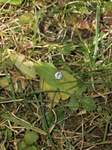 Got a text from Kim asking if I could help locate her earring she lost while raking leaves in her back yard. I told her I could stop over after work the next day. I drove over to meet her and she showed me where she thought she lost it. She blew herself off with the leaf blower so I started my search in that area. Really it could be anywhere in the back yard so I just started a grid back and forth. Not having any luck she mentioned and area where she was bending over to pick up leaves and I moved to that area. In my forth pass back and forth I got the tone and number ID on the detector I was hoping for and sure enough there was her earring in between the blades of grass. She was in her garage and I turned off my detector and walked over to her and said I think we’re fighting a loosing battle, she lowered her head but then I opened my hand and showed her her earring, and after a couple of choice names she called me a big smile of disbelief that I was able to find it came across her face. Another happy ending and a greatful lady.
