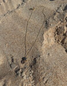 While metal detecting on the beach I was approached by two beautiful young ladies who asked if I could help them find a lost necklace in the dry sand. Apparently Jenna had removed her chain and wrapped it in the corner of her towel and then after a short swim she grabbed her towel to dry off and totally forgot about her necklace. The soft sand swallowed up her chain and she exclaimed..”Now what?” And a short time later she spotted me walking along swinging my metal detector and had the courage to ask me for some help…and I am always ready and willing to help people find their lost items. It only took a few minutes to get a good solid signal and the young ladies were all smiles!