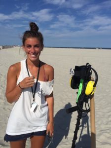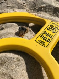 I searched under and around what I could but still wasn’t confident with out a full grid search. There was also a metal umbrella,Tonka toy’s giving off signal’s,Back packs and did not want to dissrupt them too much So I spent some time after searching other areas.Running out of luck We decided to try around the metal obstacles once more and as I was scanning,the husband must of heard what was going on and was helping move some other things for us to better search the area..Thankfully to this Nice family I was able to Find The gold ring just under the corner edge of a towel where a metal chair was.
