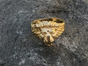 Began many years ago when Brandon’s grandfather purchased his wedding ring while active in the military. Back home in the Detroit area he was employed at an iron/steel processing plant. The ring survived being well travelled and subject to intense heat and was eventually passed to Brandon’s dad who travelled for business. At this point the ring had travelled thousands of miles and was given to Brandon after his father passed. Brandon chose to be a bit different and only wore the ring to special occasions. How nice, he thought if his father could have seen him wear the ring. Brandon’s son was of the age of knowing about the ring, so Brandon decided at an important family gathering to let him wear it. But somewhere while playing with his cousins the ring disappeared. Brandon was worried and questioned: Would this be the last tale told of the ring? On the phone I told Brandon that hunting for a gold metal lion was the only safari I was interested in! Setting up my MXT metal detector I started to grid search the area where the kids remembered roughhousing it in the grass. As I scanned the detector coil over the grass, I heard a huge ROAR in my headphones! Reaching down thru the grass I saw the face of a lion staring back at me! Brandon came running over and I told him this is as close as I want to get to a real lion! His son quickly followed, and I let him try the metal detector on the ring which he thought was really cool. Ahhhh yes, the tales of treasure lost, and treasure found…… another tale of the gold lion! What other tales of the gold lion will be told? Only time will tell.