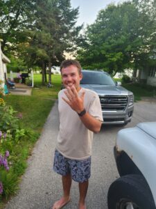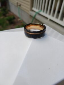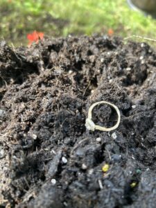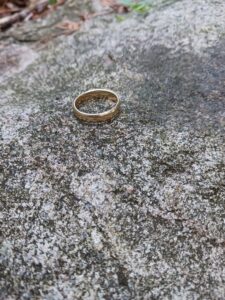For Jeff and his family a normal routine of placing his ring on a table and then going into the pool resulted in the ring being tossed into the yard. Jeff had placed his ring in his hat on the table and accidently put the cap on his head and the ring sailed out into the grassy , flower bed area surrounding his hot tub and deck. After spending a week on their hands and knees and even buying an Amazon detector they had no success, then Jeff heard about me from a news broadcast and gave me a call to investigate. After sending me a few pictures and a video tape of his yard  had a possible idea of what could have happened. I wanted to search the bushes and grassy area next to the flower bed. I surveyed the area and started detecting avoiding the electrical wires in the garden and deciding to search the area immediately adjacent to the garden and grass. I had a great signal just below the grass layer and after inserting my finger under the grass the ring came out on the tip of my finger, it was approximately 2 minutes after I had started searching. I showed him my finger and he explained I was a magician and where was it. My best guess is that his family had probably stepped on it and pushed it further into the grass so it could not be seen. The inexpensive metal detector and lack of experience did not help. He immediately texted his kids and called his wife downstairs to see the miraculous recovery that happened in my personal record breaking time. They were stunned and in disbelief that they had not found it.  I admit that I had been lucky to choose the right area and first logical choice and know my detector and the signals matching a platinum ring. It could have been a long search if the lawn mower had caught it and tossed it into the woods or if it had been taken out in the mulched grass clippings. A good day for all and two hours on the road to then start another search nearby.