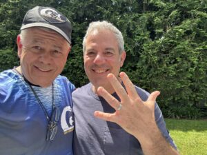 Lou and his family were at Jennings beach in Fairfield and enjoying a day in the water when suddenly while playing tag in three feet of water he noticed his wedding ring had fallen off. In a frantic effort to find it he put on his sons swim goggle and search the murky waters. He had resolved himself to the fact that the ocean had concealed it and he might have to purchase a new ring. His wife decided to put a post in social media if anyone found a ring at Jennings to let them know. One name popped into the post and said get Wayne Aguiar. A person that follows me knew I had been successful kin previous returns and thought i might be able to help. Lou found my contact information online and gave me a call late in the day. I promised I would go that night and take advantage of the tides. When I arrived a bad thunderstorm was passing through the area and the water was unsafe. I called off the search for safety’s sake and came the next morning before the beach officially opened. Lou met me there and pointed out the general area that he last remembered the ring while playing tag with his kids. It took a couple of hours and dumping buckets of trash before a I had a good signal. I dug out the signal which was around 6 inches and dumped out the scoop onto the beach. The ring miraculously rolled out of the scoop and Lou jumped down and placed it on his finger exclaiming to everyone around I had found his ring. we celebrated with selfies and again I gave Lou a St Anthony medal as a keep sake for his family. The next day Lou was very happy and in shock and disbelief I was able to find it. He contacted the Channel 12 news station and submitted pictures and selfies that we had taken after the recovery. The news station liked the pictures and the story and decided to have a televised interview. I was on another ring recovery in RI so I zoomed into the interview and shared our stories.