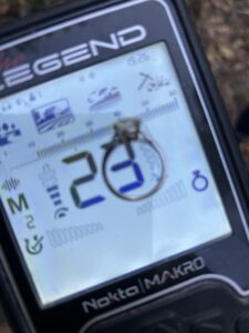 I spent probably two hours scouring the woods where she had pointed me, but no ring. Nails, bottle caps, pop tops, and other common things, but no ring. After talking with Julie again, we decided that moving the search closer to the house (into the yard) would be a good strategy. I turned my machine back on and almost immediately Julie yelled that she had found the replacement ring. I was disappointed that I hadn’t found it, but since the main thing is to get the owner and the lost item back together, it was still a great outcome. With the replacement ring found, I started looking for the “original”. I was only able to spend about 30 min that day, but promised to come back and try again.