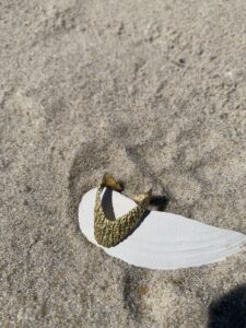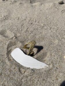 After about half an hour, I returned to the water to observe the wave pattern. As the tide receded, the waves seemed to calm a bit, so I decided to give it another try. Determined to succeed, I got back into the water and focused on the area below the shell drop. Finally, I heard a solid signal—and there it was, Megan’s ring in my scoop.