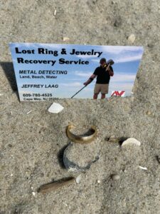 Lost a ring? DONT WAIT! Call or text NOW! 609-780-4525 Last Tuesday evening I received a call from Brenda. Brenda explained that she was at Sunset Beach with family and friends, to watch the sunset. At some point she was tossing a ball around and her ring, which was a family heirloom passed down thru generations, slipped off her finger and disappeared into the sand. Brenda and her family frantically searched to no avail. I took the short ride over to Sunset beach from home. After wading thru a sea of parked vehicles and people I met up with Brenda and her husband. After a brief discussion and search I  managed to recover her ring in about 10 minutes using my state of the art equipment and skill!
