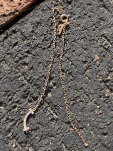 I called and was able to talk with Carly. Carly told me that not only did she and her husband, Taylor, search last night, they also searched again this morning. They just can’t find the bracelet. Carly was worried that when he dog jumped on her, the bracelet may have been eaten, by the dog or became stuck on the dog and ended up in a totally different area. She explained that it was a very thin chain with just a very small pendant, in the shape of a smile and the smile contained small diamonds. Carly also told me the bracelet was a Tiffany & Co. Bracelet. I told Carly that I would be happy to help and explained a few concerns. Very thin gold bracelets and necklaces are extremely difficult to metal detect. There just isn’t a lot of gold on them and is one of the two most difficult gold pieces of jewelry to metal detect. The other one is gold stud earrings. These very low conductive, non ferrous, metals that will barely register on a metal detector. As an example, Sterling Silver will ring up in the 90’s, loud and clear. A Men’s Gold Ring will come in and show up, as a 20 into the 60’s, depending on the size and shape. Gold stud earrings and very thin chains will only register in the 01 to 03 range and just as a whisper. In order to metal detect these items, you must set up your detector properly, to find these items. You must have the proper technique also. You have to cover an area as slowly as you can. I do not walk through the area, swinging the coil. I take one step swing the coil, low and slow, take a half step, swing, low and slow, repeating this for the entire search. If you are walking through the area, swinging, you may not find it. You must also use the proper coil, as small as possible. I have 4 coils that I swap out, depending on the job. For this search, I went with my most sensitive and smallest coil, the 8” elliptical coil. We agreed that I would search, first thing in the morning, at 8:00am