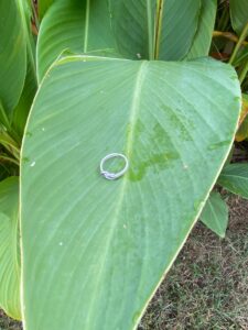 John was from out of state, working to restore services to the Lake Charles area after the destruction of hurricane Laura. He was sweeping dried mud out of his truck seat when his white gold wedding band flew off his finger. He heard it hit some hurricane debris and before heading to parts unknown in the road ditch. He and a couple of fellow workers moved some of the trash and hand searched the area, No luck. He called Carrie and I the next day for help. Within 2 hours we were on site hunting. Since John had left his own metal detector back home, I lent him mine. After hunting for a few minutes he needed to head back to work and I started hunting. Within an hour, Carrie got a good signal in a thick clump of grass. Neither of us could see the source , so I had to cut and pull some blades of grass from the clump. We both got a visual at the same time. We messaged a picture of the ring to John and soon saw him drive up. Two people had checked that same clump the day before and had not seen the ring. Lots of smiles followed.