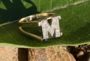 I’m not sure who was more surprised, myself or Christina.  The ring is a flat, capital letter M made up of small diamonds.  How I missed learning this detail was clearly my own fault.  In my mind’s eye I was looking for a diamond engagement ring, perhaps with a few extra diamonds on the side.  The capital letter M ring was clearly off my radar.