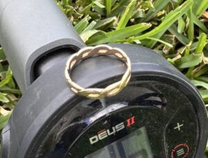 Mrs Patti was doing some yard work pulling weeds and removing all the dead leaves and branches and putting everything into some large garbage bags to be later thrown out. After cleaning everything up she went inside to wash her hands and that is when she noticed that her 47 year old gold wedding ring was not on her finger. She immediately went outside and started going through her garden beds running her hands through the dirt and mulch hoping and praying she could find her lost wedding ring. A neighbor called me and mentioned the situation and I rode over as soon as I could. Mrs Patti was very concerned and explained that she never takes her ring off and was not exactly sure where it went. I assured her that if it was there in the yard I could ver very likely find it for her and not to worry. So I searched all around the plants and combed the dirt and mulch areas well to be sure not to miss even the smallest target, thinking that maybe her ring fell in the dirt and could be up on edge making it more difficult to detect. My last area to check was the two large black garbage bags that were filled with all the debris that was to be thrown out so I laid the first large bag on its side and gently stepped on it to sort of flatten down the contents to make sweeping my metal detector coil more effectively and…Beep, Beep…my detector sounded off on an obvious target that read in the small gold ring range. So I opened the bag and dug through the sticks and leaves and caught a small glimmer of gold! There was Mrs Patti’s lost wedding ring in the trash bag…bound for the garbage but now found and back where it belonged.