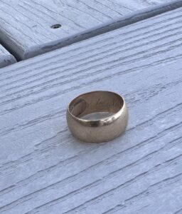 Over 160 years ago Mrs Kelly’s great great grandmother was given a very special thick banded gold wedding ring and for all these years it has been in the family and passed down from one generation to another and Mrs Kelly has been planning on passing it down to her children. Mrs Kelly absolutely loves working in her yard planting flowers and tropical plants of all kinds and a couple of weeks ago she realized her gold heirloom ring was missing from her finger. She normally wears her ring all the time but she recently noticed that it was a little loose fitting and thought of getting it resized. Her dear husband came to the rescue and tried his best to find her lost ring…even going so far as to buy a metal detector and even hired a couple of his workers to do a thorough search of the yard. All the while Mrs Kelly was very upset and troubled that her lost ring could not be found. Then one day a plumber friend suggested getting a professional metal detectorist and that led them to theringfinders.com. After meeting Mr Graig and seeing their back yard I realized that I was in for a tough challenge. I began systematically searching the grass, the bushes, the stones and around each bush beginning from the side and making my way towards the back. As I reached the middle of the back yard I was swinging my coil along a small wall of bricks and my detector gave a small chirp and as I peered over the edge I could just make out a small circle on the mulch. Bending closer I could see that it was Mrs Kelly’s lost ring just lying there waiting to be found. And Oh…was Mr Craig surprised that I actually found his wife’s lost gold heirloom ring!
