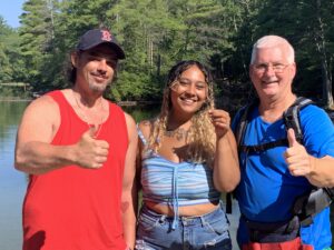 I continued the first grid line pass, but no ring. I then started back towards the Maine shore and more coins were being found, but no ring. For such a small area, there were a lot of coins. I then headed back to New Hampshire and I told John and Brooklyn that I was hoping the ring didn’t end up in the deeper water, on the New Hampshire side, of the pond. I will usually go as deep as my neck, if I feel safe. If the ring ended up in 6 feet of water, I wouldn’t be able to get it. Nothing but more coins found m heading to New Hampshire. I then turned and headed towards Maine, once again. Approximately 1/2 to 3/4 of the way to the Maine shore I received the best sounding tone, in my headphones. Unlike the Minelab Manticore metal detector, that I use, the Excalibur is by sound only. No VDI screen to show me ferrous or non ferrous. No depth gauge and no conductivity VDI numbers. The Excalibur is just by tone and tone alone. I have been using an Excalibur since 2006 and you get to know the sound of different items. Gold has a very low tone that is music to my ears. This target was the sound of gold. I stopped what I was doing and told Brooklyn and John that “this one sounds really good”. I told Cheryl to start the video because I knew if this wasn’t Brooklyn’s ring, it was still going to be gold. Because the bottom of the pond was sand and rocks, I had been fanning the sand, with my hand, because my scoop couldn’t get through all the rocks. By fanning the sand away, I could then see the target. So I knelt and bent over low, slowly fanning the sand away and then I caught a glimpse of a shiny gold ring. It had a blue stone, just like Brooklyn had said. I pick the ring up, raised my hand up out of the water and said, “there you go, I got it.” I then walked it over to the young couple and passed it to John, who then passed it to Brooklyn. She now had her extremely sentimental ring back. A ring that was once her grandmother’s engagement ring, in now back where it belongs. Brooklyn and John were all smiles and still in disbelief that she had the ring back. Just three days earlier, they thought the ring was gone forever and John mentioned to his sister that Brooklyn had lost her ring. John’s sister told him he should call The Ring Finders of Maine and John who had never heard of us looked at his sister and said, “The Ring who?” John and Brooklyn know who we are and told me they will be telling everyone about us and they will be doing it with smiles, on their faces.