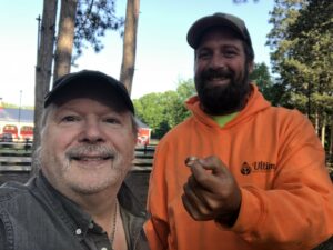…Was always one of Colin’s favorite places to work at. While just finishing up spreading some pine mulch he took a shortcut thru a corral and decided to jump over it. Landing awkwardly, he dusted himself off and headed to his vehicle and left for the day. After arriving home, he felt his ring missing. Quickly checking inside and outside the vehicle revealed no ring. Once on site we walked towards the corral only to find a bull roaming around where we needed to metal detect. I told him I didn’t bring a matador costume and asked if he had one to use while I metal detected. Laughingly he said no, but he would get someone to put the bull into another area for a few minutes. While the bull was being dealt with, I started to metal detect the area outside the corral, but no signals came thru. Entering the corral the restrained bull was watching us from afar, snorting, stomping its hooves and swinging its head around. Quickly grid searching I got a good solid signal, and my pin pointer metal detector narrowed it down. Moving some trampled dirt around revealed Colin’s stunning rose gold ring. With his back to me I yelled Charge! and as he whirled around thinking the bull got loose, he saw me holding up his ring and said… Now that’s really taking the bull by the horns! Ole!