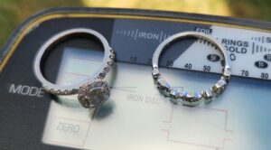 So in a last ditch effort before the yard guys came out he turned to the Internet to see if anyone did this kind of searching and immediately the Dallas Ring Finders popped up.  We arrived the next afternoon.  Fortunately he had a matching Ear Ring we were able to get a signal to match too.  After searching the yard with our Garrett AT Pro’s running on their highest sensitivity we had no luck.   So we had to get out our secret weapon our “Garret Super Sniper Coil” that is designed for very tiny objects.  After getting a matching reading on the 2nd Ear Ring we were about to give up searching, I decided to check the prime target area one more time and I got a matching signal.  Using our Garrett Pinpointer I worked it into the very thick grass and I saw the glint and I knew I had it.  And the rest is happy history…..