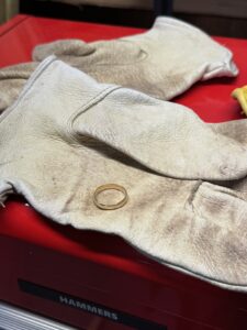 While I was searching, Steven and I had been chatting about our common interest – history. After maybe 45 minutes with no luck, Steven invited me to see his workshop. Turns out that Steven collects antique tools and wanted to show me. While we were there, I had a thought and asked if he or his wife had checked the gloves she was wearing. He said they both had checked, but I asked if checking one more time would be ok. He agreed and with my handheld detector, found that the ring was still in the finger slot of one of the gloves. We were all surprised, but it’s always a good feeling to recover something that means a great deal to someone. Another happy ending!