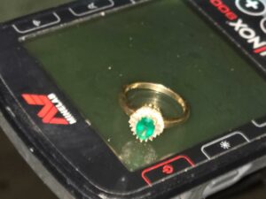 I got to the beach in a good amount of time because of traffic at this hour, and met up with Georgia. We went to the area of the loss where she explained what she believed happened to lose the ring. I went right to working a tight grid in the darkness. Finding pieces of trash metal is not uncommon. so to dig every signal especially at night is very important. After about 10 minutes I had her ring, and was able to return it to her. It helps when the person can meet me at the spot to narrow down the search area, and this was another reason for success. She very happy to have her ring back.