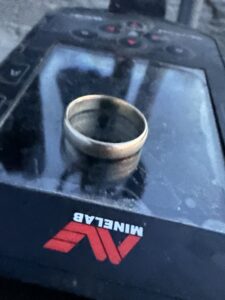 When I got to John’s house he met me at the spot of the loss, and explained how he believed it occurred. I turned on my detector, and John went back to the house allowing me to get right to work. I made a couple of sweeps with my coil, and then I had to move a metal stake to cover another area. Right then I received the signal I was looking for, put in my pin pointer, and had John’s ring in about 2 minutes. I called him, and asked, “how fast did he want this job done?” He could not believe it was found so quickly. It does make a big difference when a person has the right equipment, and is expert in using it. Needless to say John was ecstatic at having his ring recovered.