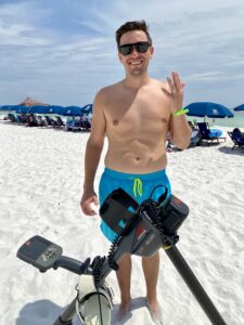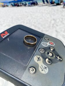 When I arrived, I started at the water’s edge, searching the drop-off zone first. No luck. I worked my way higher into the wet sand—still nothing. I debated whether to head into the water or stay dry a little longer, and I’m glad I chose the latter. After a few more passes, I got an awesome tone and number on my machine. I knew I had it.