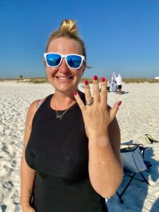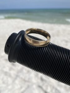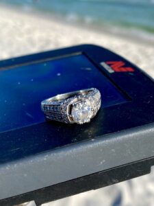 She and her husband were down from near Indianapolis, exploring the area and thinking about moving here. They decided to spend some time on our beautiful beaches. While throwing a football at the water’s edge, Amanda slightly jammed her ring finger. Worried about swelling, she took off her ring and put it on her right hand. It wasn’t the best fit—but it seemed fine for the moment.