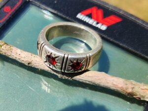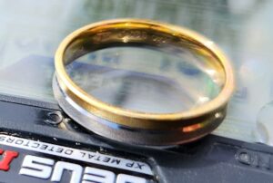 For my metal detecting friends, here are the target identification numbers on the 4.5g, white and yellow gold ring: Deus 2=60, Equinox 900=25